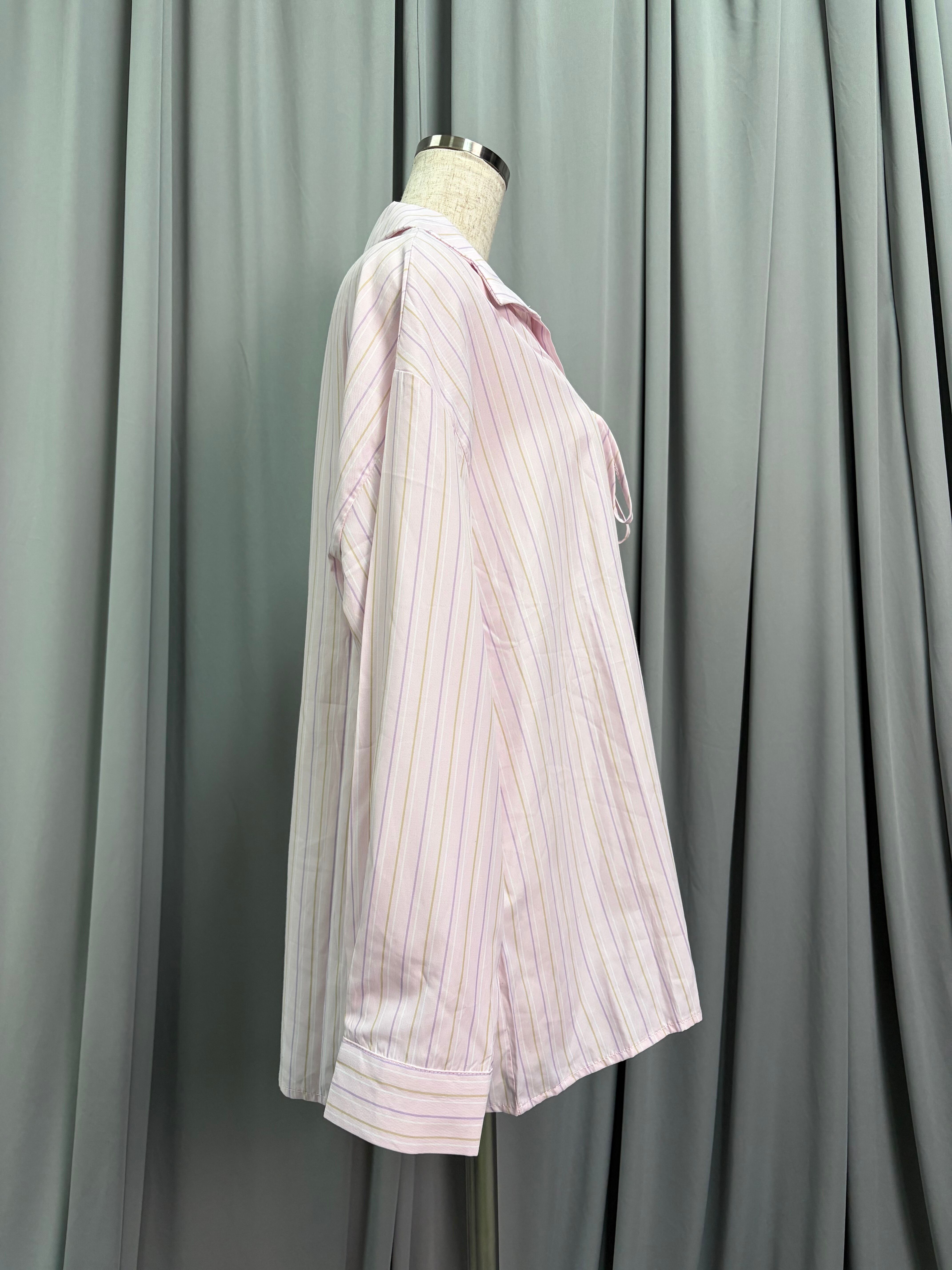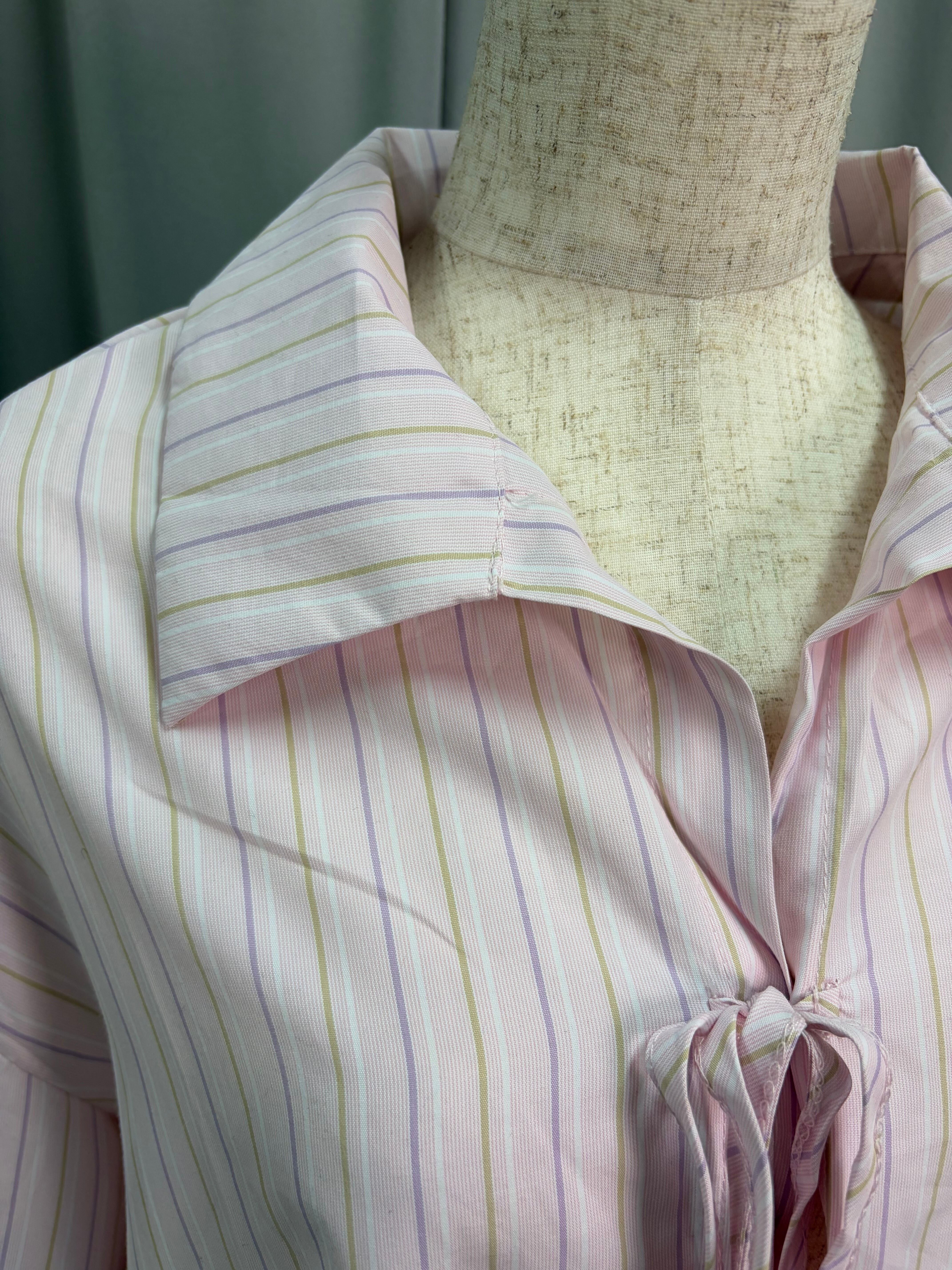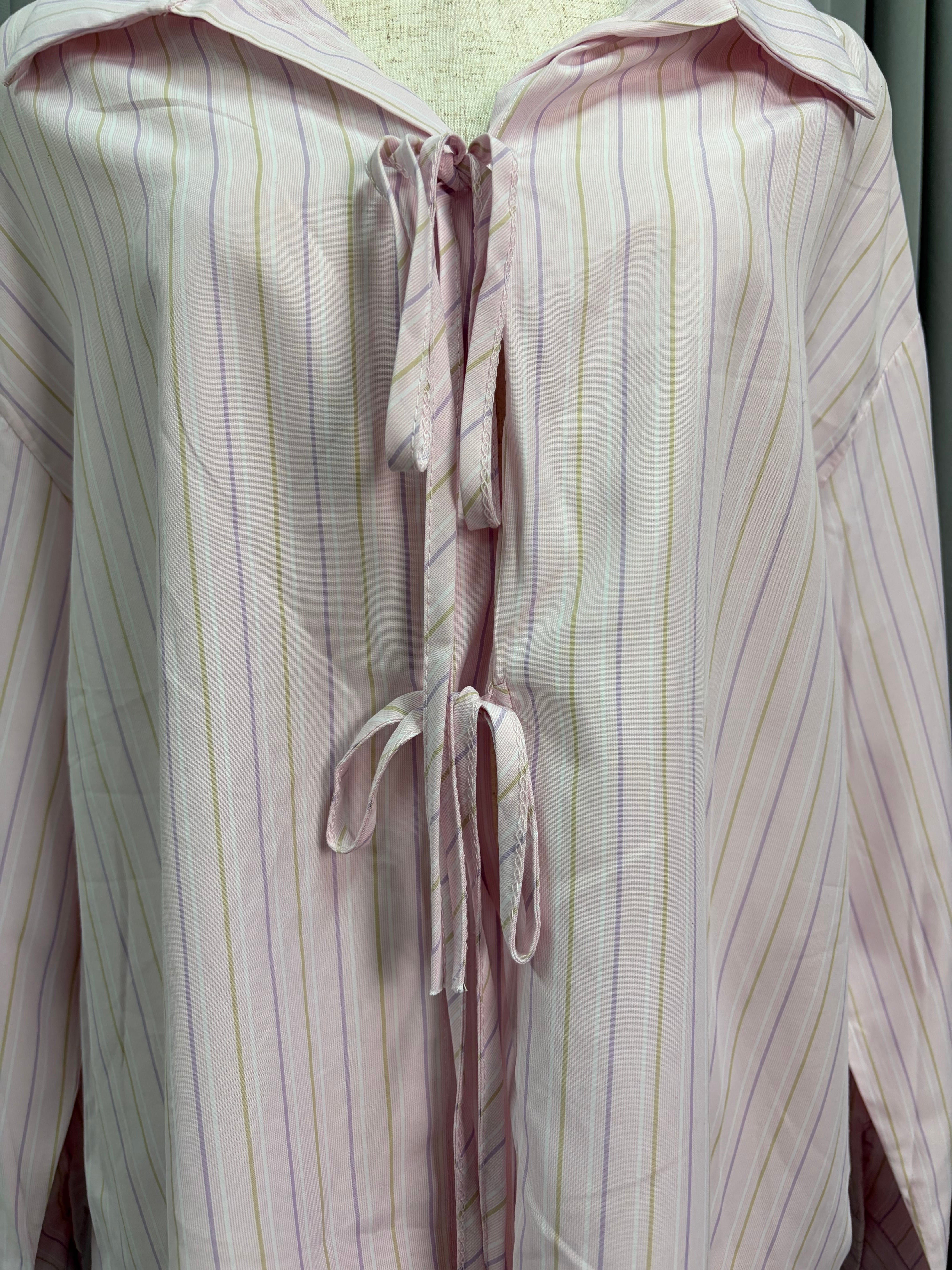 淡いカラーとストライプ柄がやさしい印象のシャツトップス。