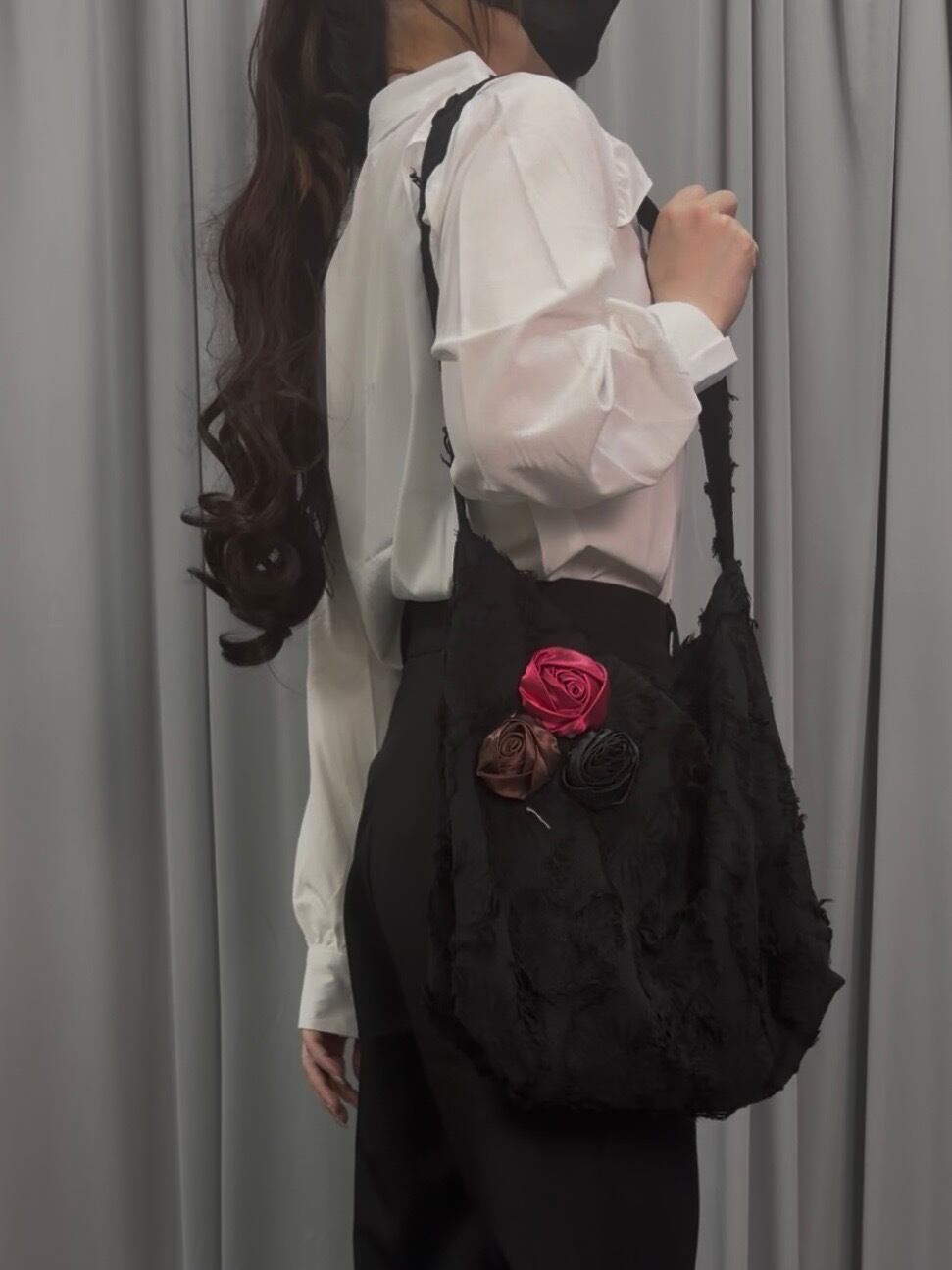 立体的なローズモチーフがアクセントになり、コーデにさりげない甘さをプラスします。